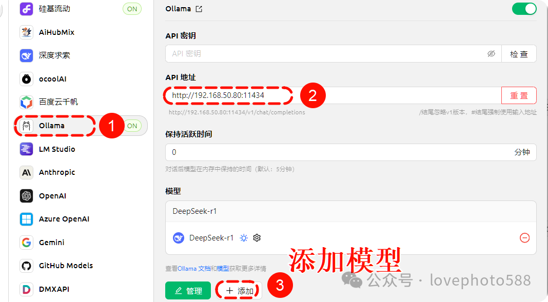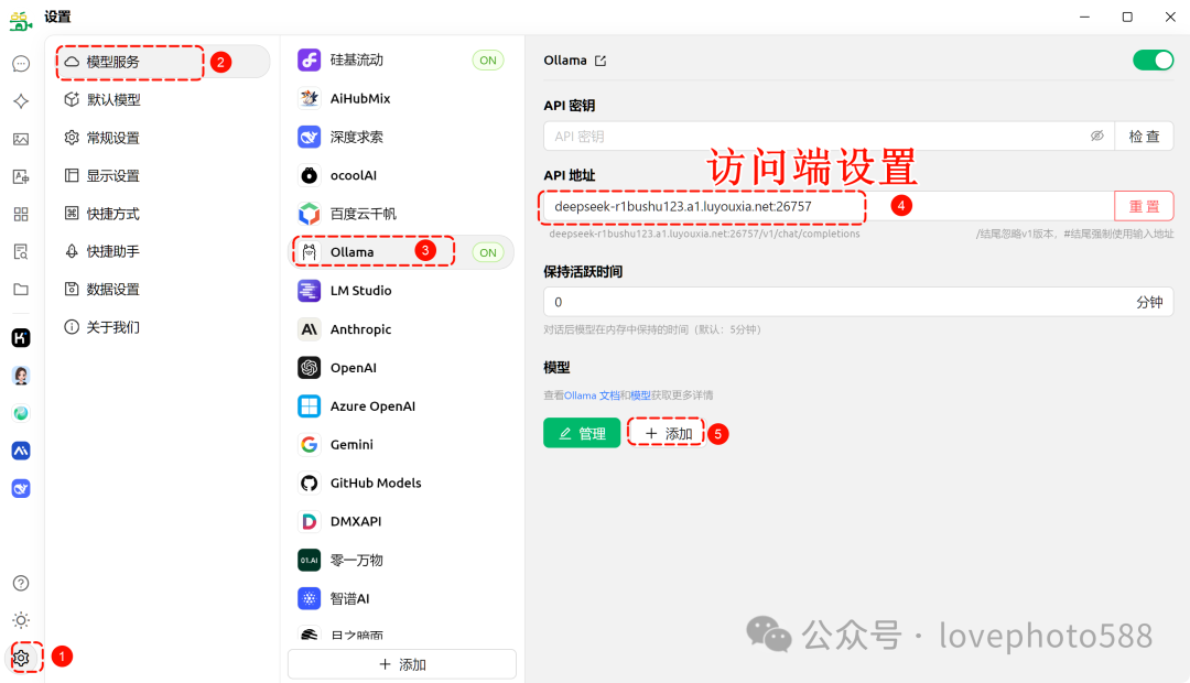 1、Cherry studio访问端设置:在设置——模型服务——Ollama——API地址 中粘贴地址,再添加模型设置后重启Cherry studio。