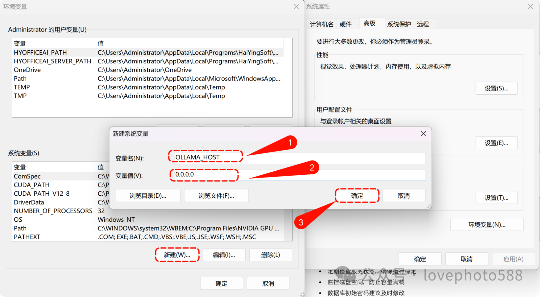 3、新建系统变量名为:OLLAMA_HOST ,值设置为0.0.0.0 。