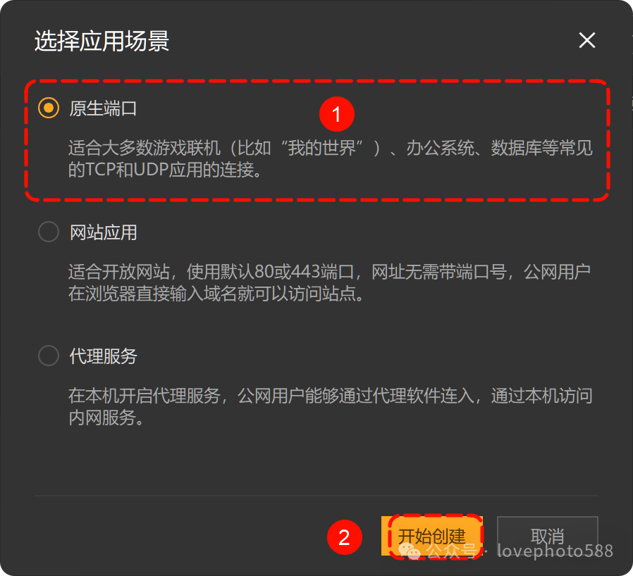 3、选择 选择原生端口——开始创建。