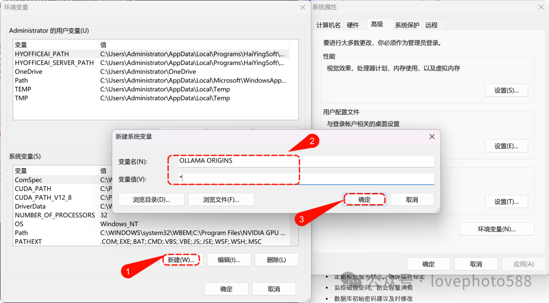 4、再次新建系统变量名称为:OLLAMA ORIGINS ,值设为:“ * ” 。