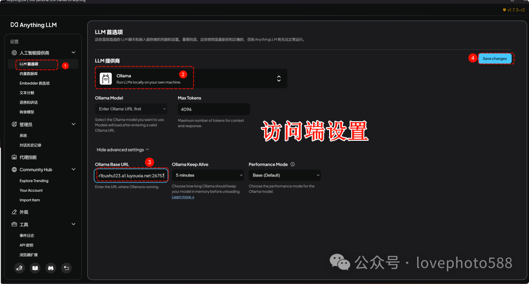 2、AnythingLlm访问端设置:首选项——Ollama——Ollama URL 中粘贴复制的地址,设置完成后设置后重启AnythingLlm。
