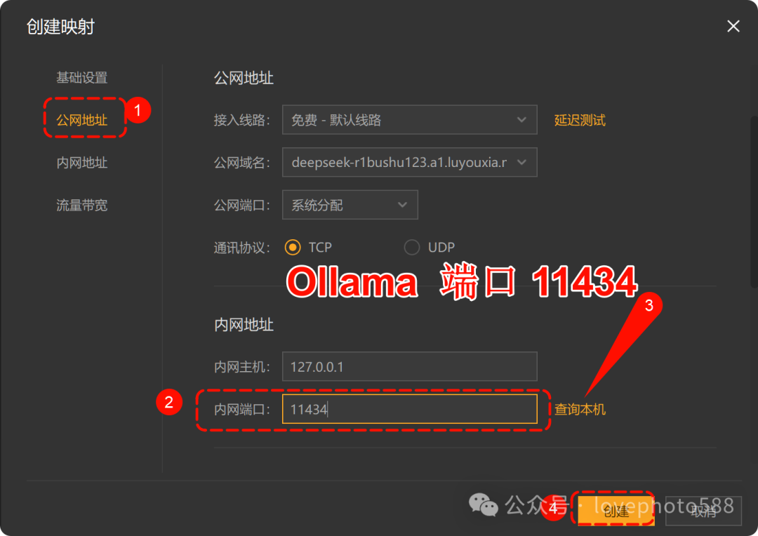 4、配置公网地址:设置端口为Ollama 端口,然后点击创建。