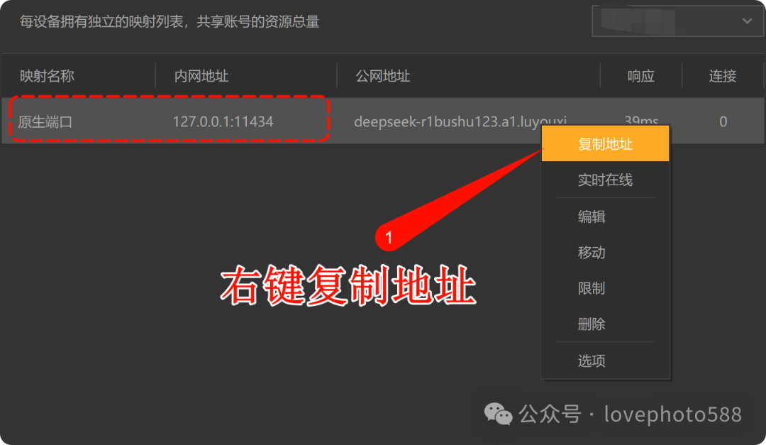 5、创建完成后即显示创建的映射内容,右键复制地址,接下来将复制的地址粘贴到对应部署的工具中。