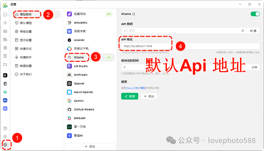 1、被访问主机设置:默认Api :http://localhost:11434,保持默认即可。