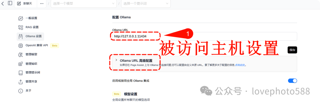 1、被访问主机设置:使用Page Assist浏览器插件本地部署的,被访问主机默认本地访问:http://127.0.0.1 : 端口:11434 即可。