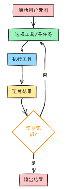 - 解析用户意图 → 2. 选择工具/子任务 → 3. 执行工具 → 4. 汇总结果 → 5. 输出或继续下步。