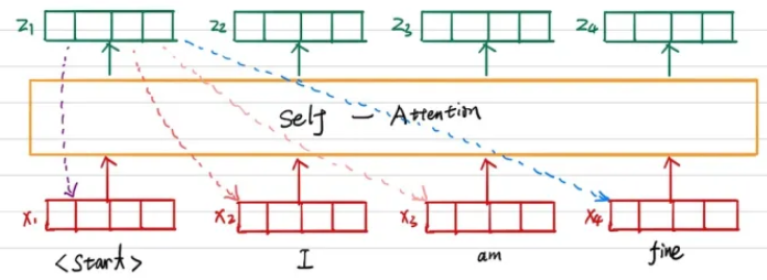 上图是一个普通的自注意力机制示意图,实际上Encoder部分的自注意力机制大概就是这个关系。图中为了不太凌乱,我没有画出z2 、z3、z4 与x1:4 的关联,实际上Z1:4 和x1:4