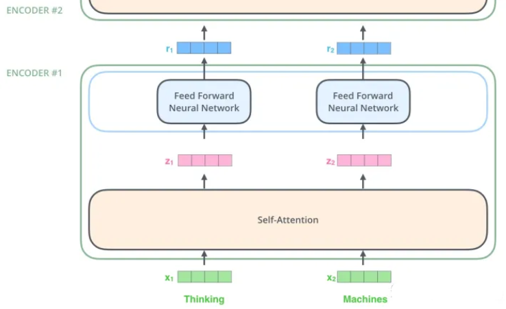 这样说可能还有点抽象,如上图所示, x1 和x2 表示“Thinking”和“Machines”的embedding。