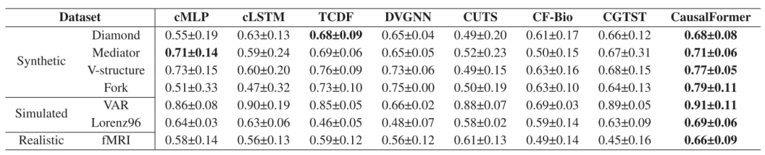 图4 CausalFormer与基线方法的总体F1分数(平均值±标准差),其中每个基准测试的最高分以粗体标出