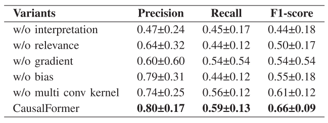 为了验证CausalFormer中关键设计的有效性,论文进行了消融实验。具体来说,研究了回归相关性传播 (Regression Relevance Propagation, RRP) 这一核心解释方法的作用。通过比较使用完整RRP与使用其变体(忽略偏置项 bias_relevance 的简化版本)的性能,来证明RRP设计的必要性和优越性。