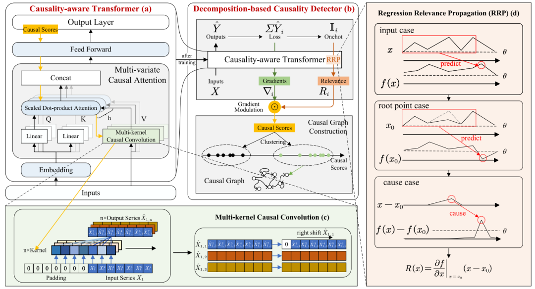 2.这项可解释的因果感知Transformer模型通过多元因果注意力和多核因果卷积学习时序因果关系的表征,基于分解的因果检测器则借助提出的回归相关性传播方法,为回归模型实现基于分解的因果解释。该架构使因果感知Transformer具备完整可解释性,能够计算每个潜在因果关系的因果分数,并构建时序因果图。。
