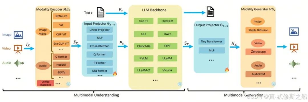 例如在 NExT-GPT 架构中,存在专门用于图像、音频、视频的输出投影器模块,支持“指令对齐”生成能力。通过这些输出桥梁,模型可以根据语言模型的输出自由转换成不同模态的生成任务,提升多模态生成的统一性与准确性。