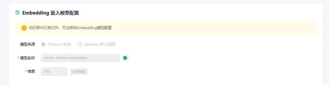 同样支持选择 Ollama 本地模型或配置外部 API 服务。请注意:一旦知识库中有文件开始使用,Embedding 模型将无法再修改。