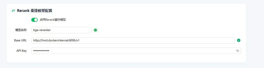 Rerank 模型需通过 API 方式接入。我在 Ollama 的模型库中没有找到合适的 Rerank 模型,因此选择在本地 Docker Desktop 中部署 fastgpt/bge-rerank-base:v0.1 镜像来提供该服务。