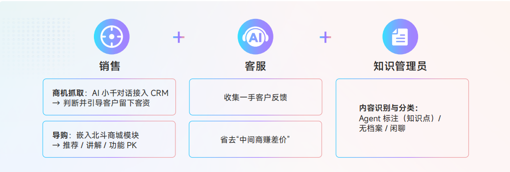 几个月前在千寻位置“上岗”的001号员工AI小千,客户回答完备率达到50%,解放一半人力。原本需要10个人一起做的客服工作,如今只需要1个AI小千和3个客服人员即可完成,千寻位置则可以把多出来的人力放在反哺优化产品上。AI小千还可以接入售前、售中、售后三个环节,既完成分内客服工作,又能给潜在客户推荐对应产品、整理产品知识库,实现“一人三职”。