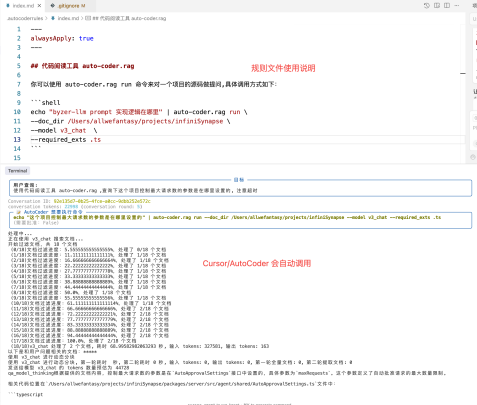 这意味着你可以随时随地的对任意一个目录进行 RAG 查询。命令行的方式几乎可以被任何Agent 调用,你可以很轻松的嵌入到 Cursor/Auto-Coder/Claude Code/Codex/Qoder 中,你只需要给这些 Code Agent 通过 Rule 添加一个简单的使用说明, Code Agent 就会在合适的时候使用知识库进行学习: