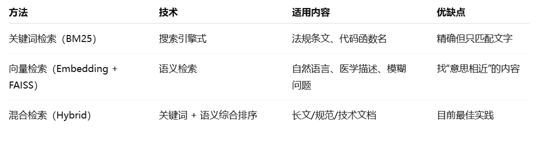 - Hybrid 检索:向量 + BM25 混合(上面已示范);代码类问题对关键字很敏感