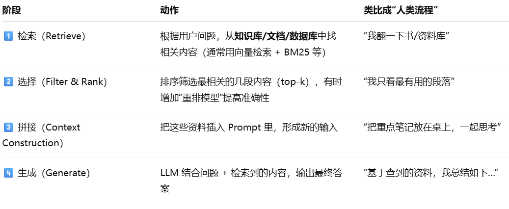 核心结构:用户问题 → 检索器(Vector DB / BM25)→ 文本片段 → 组装 Prompt → 大模型 → 回答