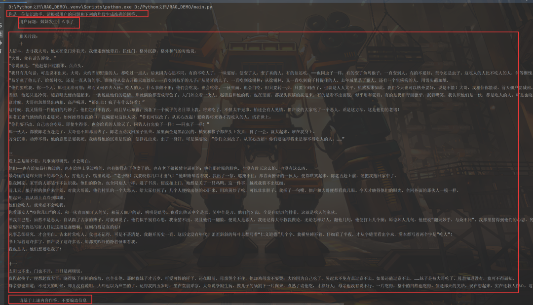 运行后,最终prompt如上,相关片段就是RAG的结果,本篇主要是应用化实现,实际产品中仍需进一步优化。