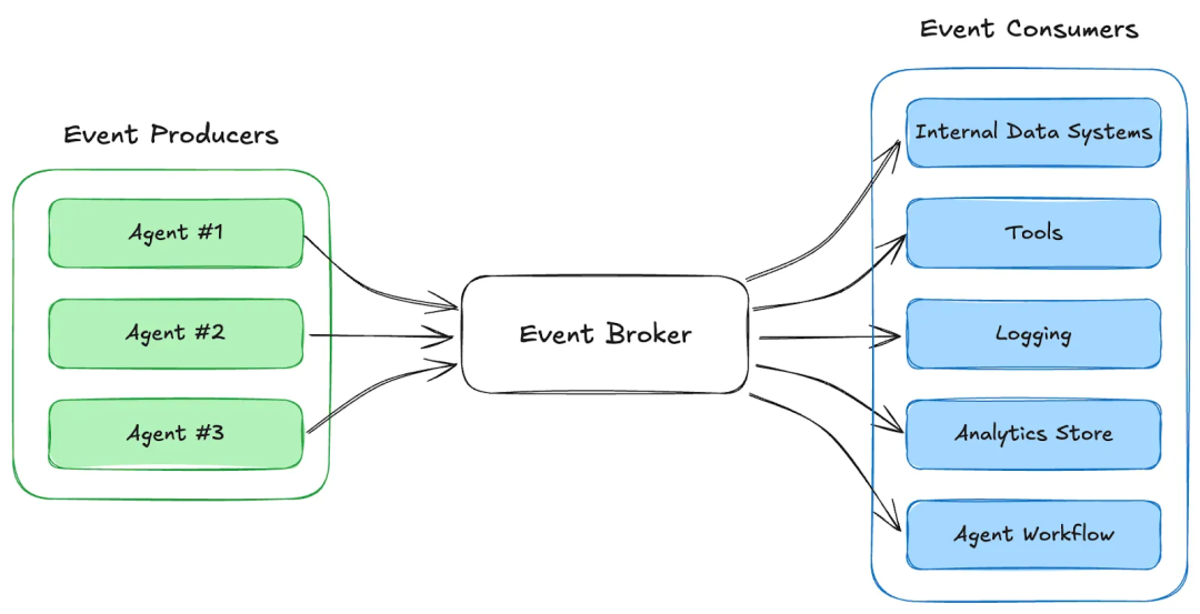 此外无论使用哪种架构我们都还必须考虑agent 的特殊性,这主要是在分布式环境下供给推理、决策、和协作的上下文信息共享问题。这使得构建代理时对如何管理依赖关系和确保实时数据流产生了独特的需求。EDA 消除了这些限制。通过解耦工作流程并启用异步通信,EDA 允许系统的不同部分(代理、数据源、工具和应用程序层)独立运行。