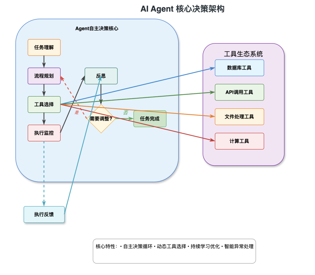 - llm 给我们带来的是,可以在程序运行的过程中自己来思考如何编排或者协调我们定义的各种模块,这主要包括自主流程拆解,动态模块决策,实时决策调整,动态外部交互。