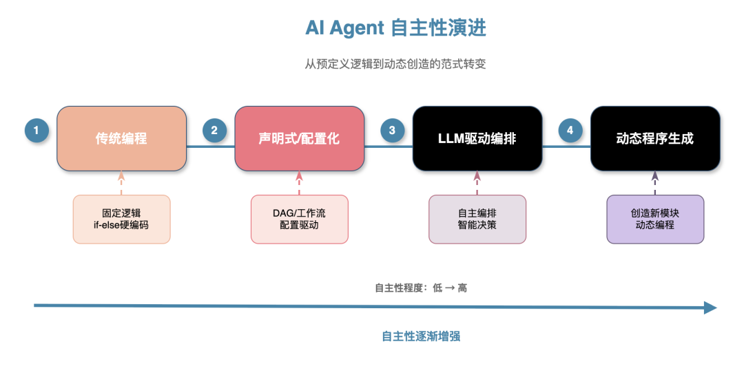 AI Agent 带来的自主性给我们的软件编程范式带来了巨大改变。 从传统编程命令式到声明式再到如今 Agentic 决策再到动态能力扩展,不得不说我们的变成习惯和思维需要做出适应 Agent 时代的改变。