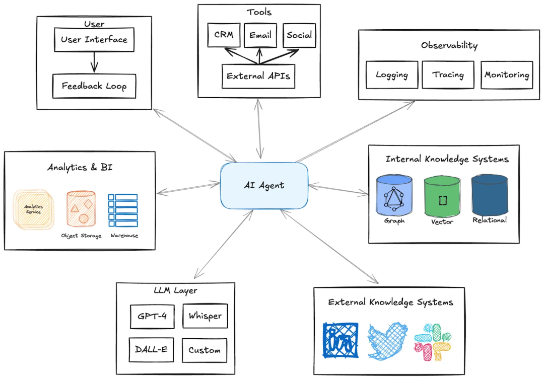 技术发展到目前,在分布式场景下,微服务架构仍旧是目前主流的选择,在 Agent 系统中我们仍旧可以使用微服务架构,与微服务一样,Agent 必须高效通信并确保其输出在更广泛的系统中有用。与任何服务一样,它们的输出不应该只是循环回 AI 应用程序,还应该流入其他关键系统,如数据仓库、CRM、CDP 和客户成功平台。