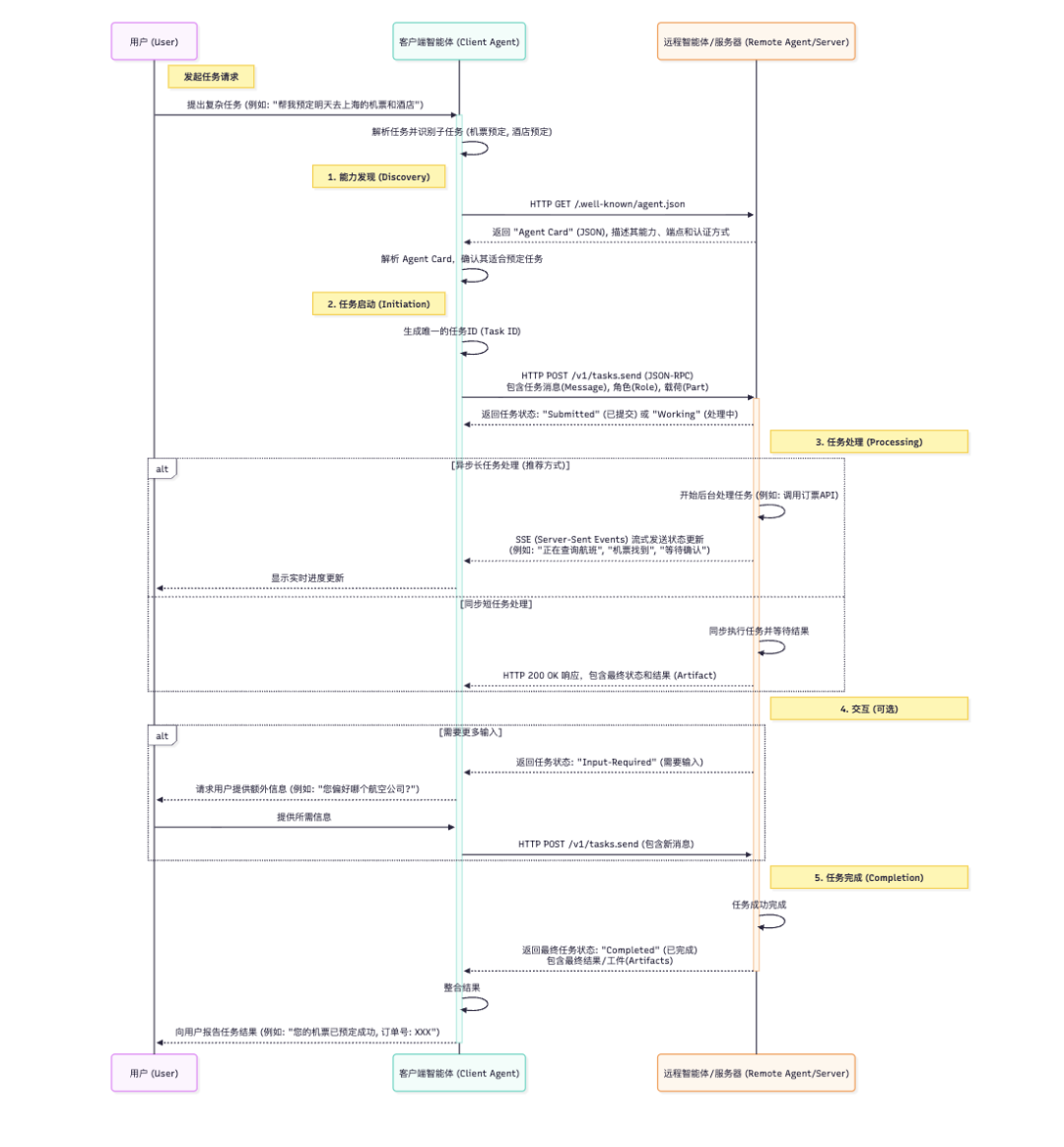 任务处理:客户端智能体将任务委托给远程智能体(服务器代理),并通过任务ID跟踪状态。