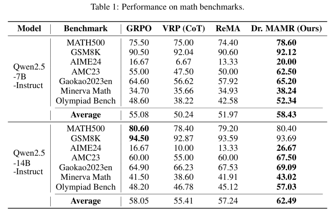 表 1中呈现的结果是显著的。首先,标准的 ReMA 框架 consistently 表现不如一个强大的单智能体 GRPO 基线,这实证地证实了惰性智能体问题严重阻碍了多智能体的性能。与之形成鲜明对比的是,我们的 Dr. MAMR 框架在所有模型大小和基准测试中,都 consistently 且显著地优于所有基线。 这表明,通过解决惰性智能体问题并促进真正的审慎推理,多智能体系统最终能够释放其全部潜力,并超越单智能体的能力。