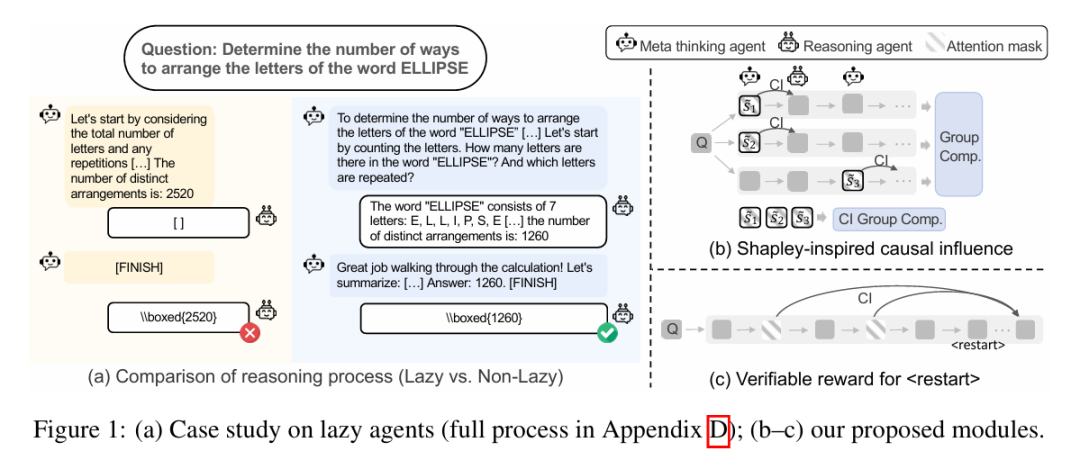然而,尽管前景广阔,我们的研究揭示了一个关键且惊人常见的故障模式: "惰性智能体"问题 。我们观察到,在使用标准强化学习技术训练的多智能体系统中,一个智能体常常变得被动,对协作贡献甚微。如图 1(a)中的案例研究所示,推理智能体可能产生空白或琐碎的响应,实际上将整个推理负担转嫁给了元思维智能体。这种动态破坏了协作的根本目的,导致复杂的多智能体系统退化为无效的单智能体系统。这一现象尤其令人费解,因为智能体是顺序行动的,理论上一个智能体的低质量输出会阻碍整体进程,并在训练过程中受到抑制。但相反,我们发现这种惰性行为不仅存在,而且被系统地强化了。
