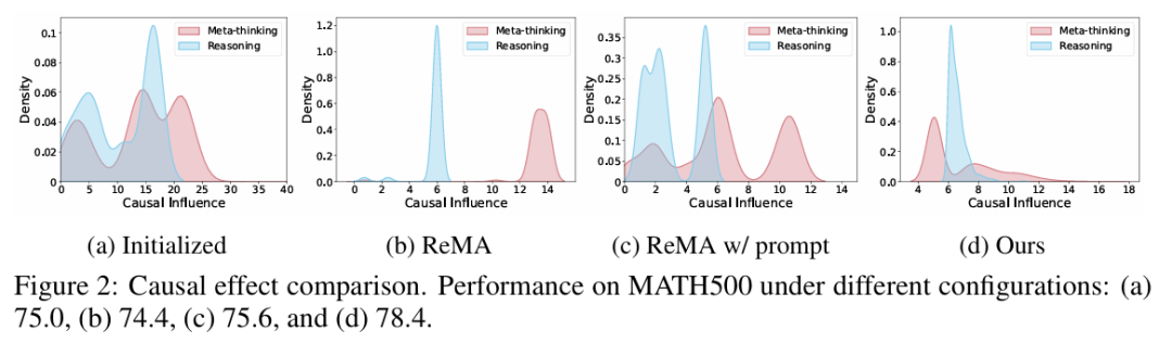 我们总结在图 2中的实验揭示了一个清晰的模式。当像 ReMA 这样的多智能体系统被训练时,推理智能体的因果影响力(起始于合理水平)会随时间推移稳步减弱。相比之下,元思维智能体的影响力则增长,表明其已接管了整个任务。这种不平衡并非无害;它对应着整体任务性能的下降。虽然明确提示推理智能体更加主动可以略微缩小这一差距,但这未能解决根本问题,表明问题深植于训练动态之中。