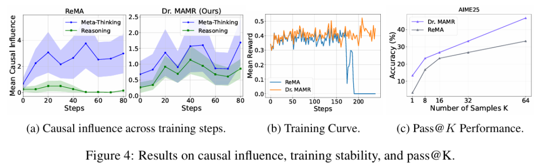 图 4(a))。 - 训练稳定性: Dr. MAMR 表现出远高于 ReMA 的训练稳定性。当 ReMA 的奖励信号迅速崩溃时,Dr. MAMR 保持了稳定且改善的奖励曲线,展示了稳健有效的学习(