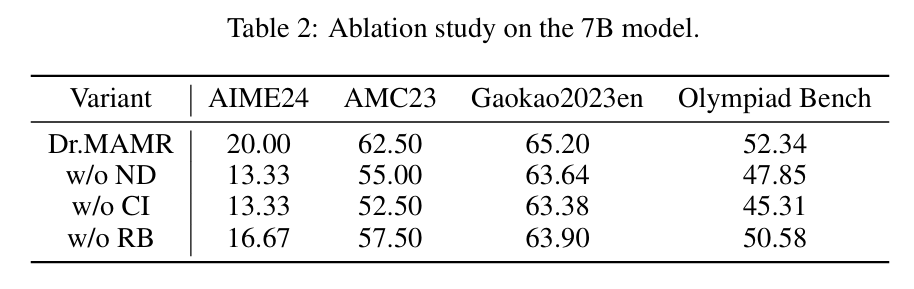 消融研究(如表 2所示)证实了每个组件的重要性。移除归一化去偏、因果影响力奖励或重启行为中的任何一个都会导致性能明显下降。这凸显了这些组件协同工作,以阻止走捷径、促进平衡贡献并实现从错误中恢复。