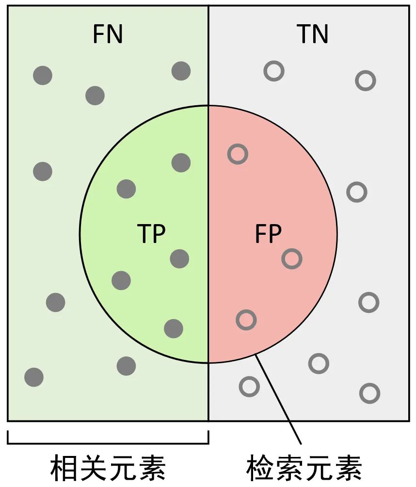 如图2所示,左侧的所有实心样本点为正样本(相关元素),右侧的所有空心点为负样本,中间的圆形区域为模型预测的正样本(检索元素),即圆形左侧为模型将正样本预测为正样本的情况,右侧为模型将负样本预测为正样本的情况。例如现在可以想象这么一个场景,某一次我们在使用搜索引擎搜索相关内容(正样本)时,搜索引擎一共检索返回了30个搜索页面(搜索引擎认为的正样本),而搜索引擎返回的结果就相当于是图3-8中对应的圆形区域,所以精确率和召回率还可以通过图3来形象地进行表示。