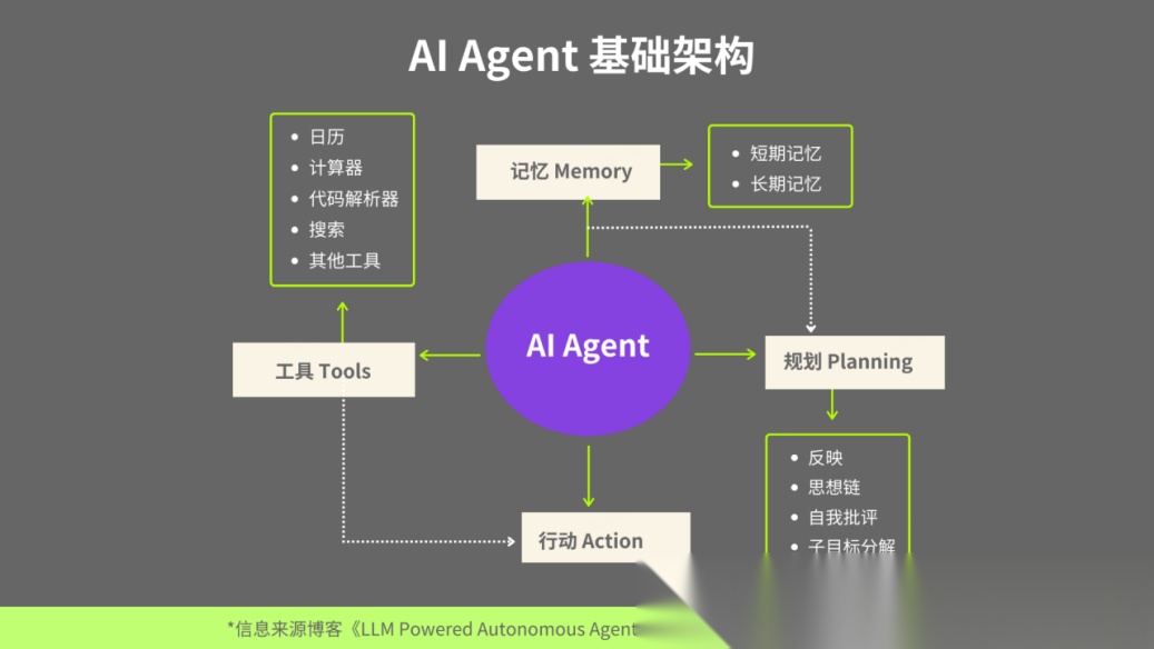 理解现代 Agent 的关键在于认识到:大模型通常是其核心的“大脑”或“决策引擎”。一个典型的 Agent 架构可能包含: