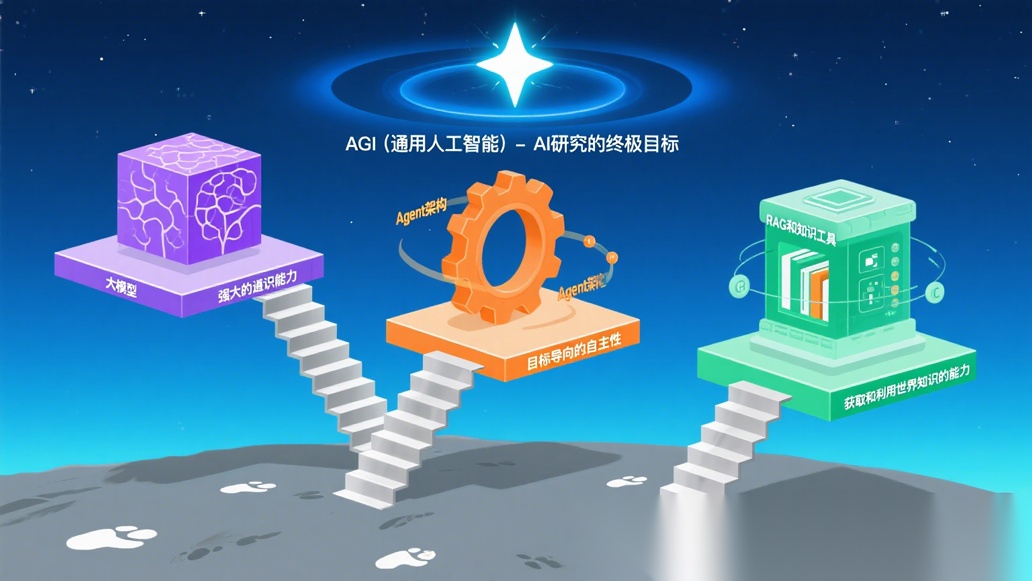 AGI 是 AI 研究的“北极星”,是终极目标。当前我们所讨论的大模型、RAG、Agent 等技术,都是通向 AGI 道路上的重要里程碑和探索方向。大模型展现了强大的通识能力,Agent 架构探索了目标导向的自主性,RAG 和知识工具增强了其获取和利用世界知识的能力。