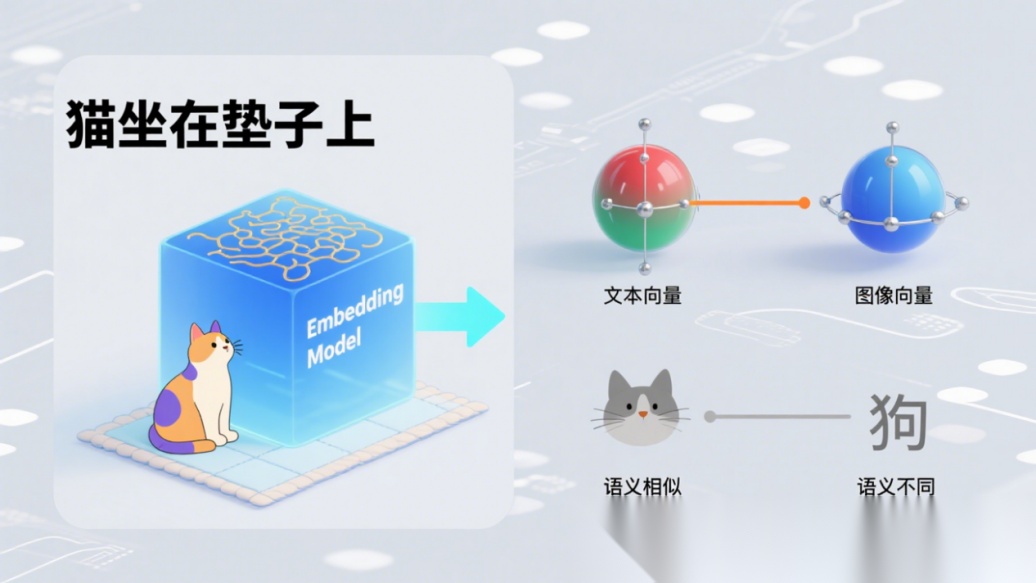 1.向量化(Embedding):利用嵌入模型(Embedding Model,通常也是一个深度学习模型),将文本、图像等内容转化为固定长度的数值向量(例如 768 或 1536 维)。这个向量在数学空间中捕捉了内容的深层语义特征。语义相似的文本,其向量在高维空间中的距离(如余弦相似度)会很接近。