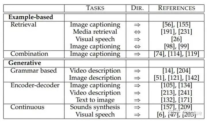 跨模态翻译的目的是学习如何将源模态映射(map)到目标模态。例如:输入一张图像,我们希望生成一句话描述它,或者输入一句话,我们生成与之匹配的一张图。主流方法分为两类: