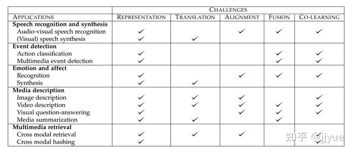 表征学习是多模态任务的基础,其中包含了一些开放性问题,例如:如何结合来源不同的异质数据,如何处理不同模态的不同噪声等级,测试样本的某种模态缺失怎么办。