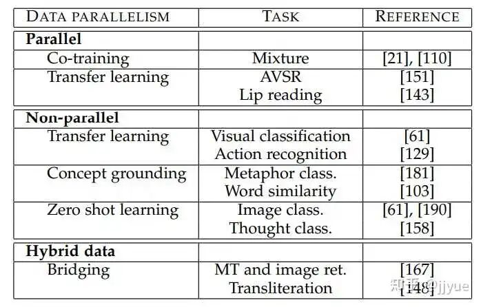 并行数据方法需要训练数据集,其中来自一个模态的观察直接与来自其他模态的观察相关联。换句话说,当多模态观察来自相同的实例时,比如在一个音视频语音数据集中,视频和语音样本来自同一说话者。
