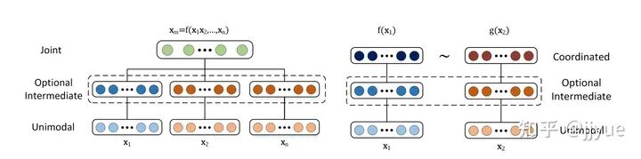 现有多模态表征学习可分为两类:Joint(联合,也称为单塔结构)和Coordinated(协作,双塔结构)。