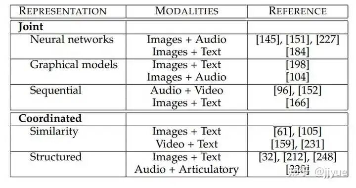 在测试阶段,由于Coordinated结构保留了两个模态的表示空间,它适合仅有一个模态作为输入的应用,如跨模态检索,翻译,grounding和zero-shot learning。但是Joint结构学习到的 x_m 只适用于多模态作为输入,例如视听语音识别,VQA,情感识别等。