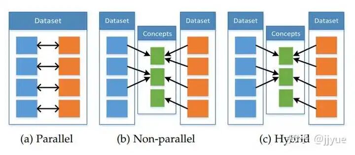 在混合数据设置中,通过共享模态或数据集来连接模态。