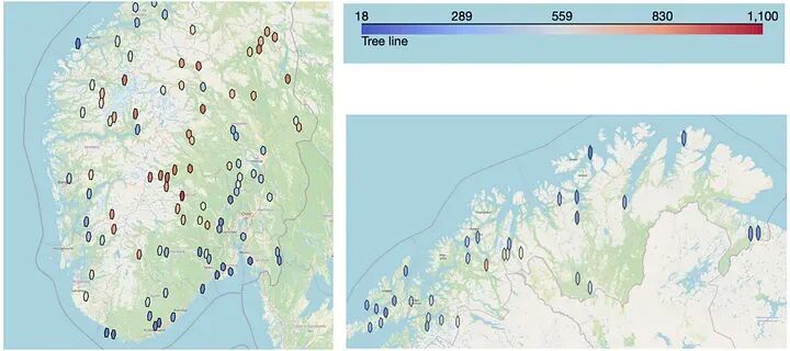 这是树线数据,从图像中提取,使用Uber的H3技术绘制在挪威地图上。您可以看到树线如何向海洋和北方变得更冷(更低),如果您向内陆看,它变得更暖(更高)。图片由作者提供,