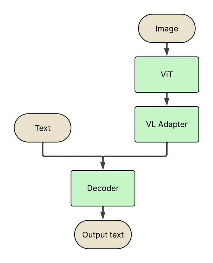 此图显示了VLM的标准架构布局。图像通过ViT(视觉变换器)处理,从中提取视觉标记。然后这些标记通过VL(视觉语言)适配器传递,以确保图像标记与文本标记在相同的嵌入空间中。输入模型的文本简单地进行标记化。文本和图像标记然后都输入到解码器中,解码器产生输出文本。