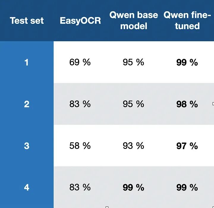 这是三个不同模型在四个测试集上的结果。您可以看到EasyOCR表现不佳,其结果如此糟糕,您无法信任它提供的数字。Qwen基线模型表现相当好,从93-99%不等。在某些情况下,这可能是可接受的性能,但对于我正在处理的数据集和我的性能期望来说还不够。但是,您可以清楚地看到模型的微调工作得很好,它在除第4个测试集之外的所有测试集上表现都比基线Qwen模型更好,其中两个模型同样好。Qwen基线和微调模型基于阿里巴巴的Qwen 2.5 VL 7B。