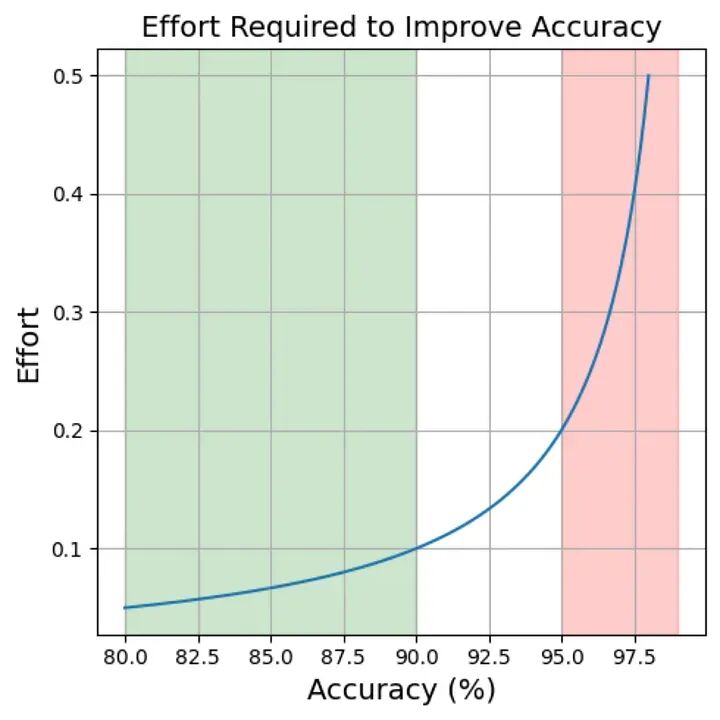 这是我创建的任意图表,显示了提高模型准确性所需的努力量。如您所见,从80%到90%准确性所需的努力比从95%到99%准确性所需的努力要少得多。图片由作者提供。