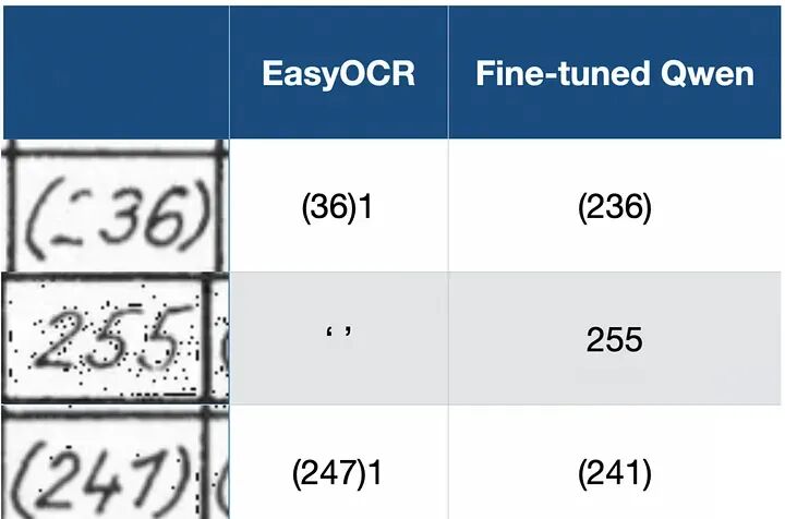 然而,这些模型经常被现代大语言模型超越,特别是那些结合视觉的模型(通常称为VLM或VLLMs)——下图突出了为什么您想要使用VLM而不是传统OCR引擎。第一列显示了我们数据集中的示例图像,另外两列比较了EasyOCR与我们在本文中训练的微调Qwen模型。