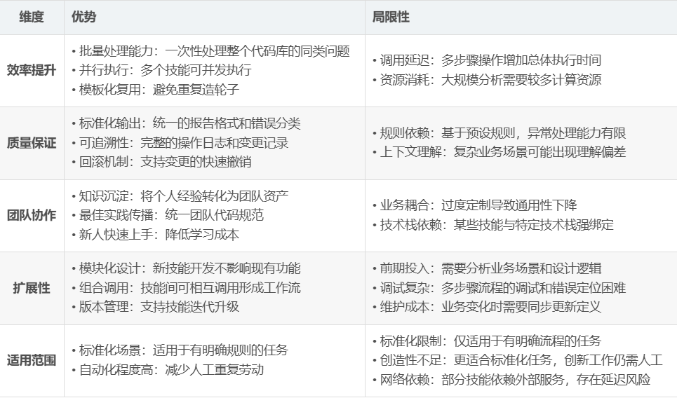 Agent Skill本质上是将工程经验固化为可复用的AI能力模块,通过标准化封装降低AI工具的使用门槛。它在提升效率、保证质量、促进协作方面具有显著优势,但也需要权衡开发成本和技术局限性。