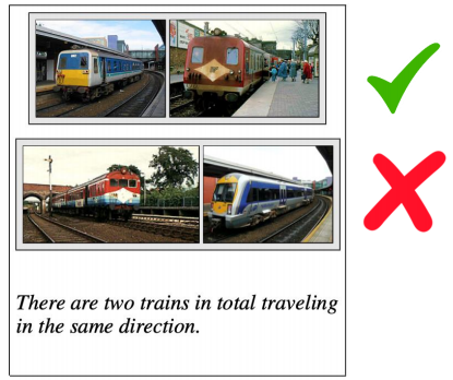这个任务难度升级,要求模型不仅能看到,还要能思考。给定两张图片和一段文字描述,模型需要判断这段文字是否准确地描述了两张图片的内容。